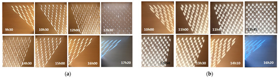 Light and shadow projection on the floor of the test box at different hours of the day for two opening angles of flaps: (a) angle at 45° on November 12, and (b) angle at 90° on November 16. Blue light at the end of the day is due to more diffuse illumination than the rest of the day.