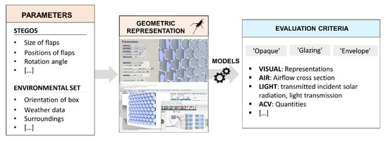A geometrical model of the prototype integrated into the test box was created under Rhinoceros Grasshopper. Geometrical parameters, either related to the Stegos or to the general set (orientation, weather, and date), were defined as variables to be tested and compared with regard to various indicators related to air, light, and heat regulation functionalities, as displayed in Figure 13.