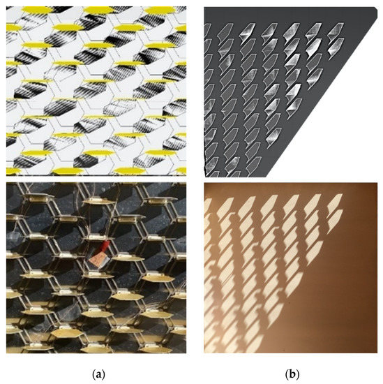 In the ‘glazing’ configuration, the Stegos acts as a solar shading device and thus as a light-management system. The objective here is to validate the geometrical representation through Rhinoceros Grasshopper. For this purpose, a daylight analysis was performed on a southern-fixed orientation, located in Bordeaux (France), and with dates set as the dates of the experiments described in Part 3. The angles of the flaps varied from 0 to 90° and were positioned horizontally. A comparison between the simulation on Grasshopper and photographs of the experiments illustrated in Figure 14 shows very similar light projections. It is important to note that this comparison can only be qualified as qualitative, as the authors do not provide numerical analysis of the photographs and because of inevitable distortions due to perspective.