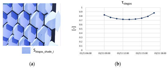 (a) The shaded surface on the Stegos is the sum of all SStegos_shade_i. (b) Simulated τStegos for the 1 November (data for location: Bordeaux, France).