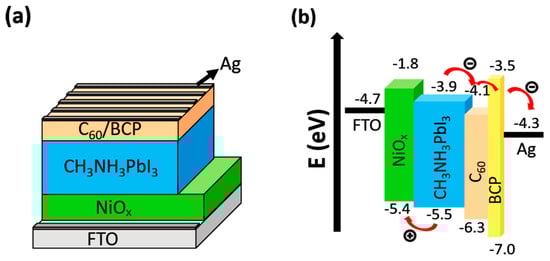 The work functions of FTO, NiOx, CH3NH3PbI3, C60, BCP, and Ag are also given in Figure 1b. When the light irradiates onto an absorber layer of the CH3NH3PbI3 film, the electrons were pumped from the valence band to the conduction band. Immediately, the electrons transport to the electron transport layer (ETL) of the n-type C60, while the holes transport to HTL of the NiOx layer. The C60 has a lower work function (−4.1 eV) which matches with the lowest unoccupied molecular orbital (LUMO) energy level of perovskite film (LUMO = −3.9 eV). The band structure of CH3NH3PbI3/C60 further accelerates the electron transport to the silver cathode (LUMO = −4.3 eV). To effectively guide holes, the work function of p-type NiOx (−5.4 eV) must be matched as much as possible with the Highest Molecular Orbital (HOMO) energy level of the FTO (HOMO = −4.7 eV). In order to avoid annihilation of a hole with an electron at the Ag electrode, the BCP is used to prevent hole transmission to the silver cathode, avoid electron and hole recombination at the interface while the p-type NiOx prevents the electron injection into the anode to affect the efficiency of the hole.