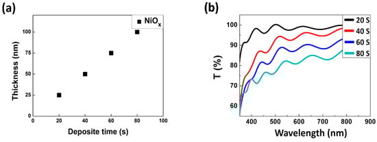 NiOx films prepared to various deposit times: (a) from deposit times: 20 s, 40 s, 60 s, and 80 s, respectively, were annealed at 500 °C for 1 h. The equivalent thicknesses are 25 nm, 50 nm, 75 nm, and 100 nm, respectively; (b) transmittance vs. wavelength (350–900 nm) for various NiOx thin films.