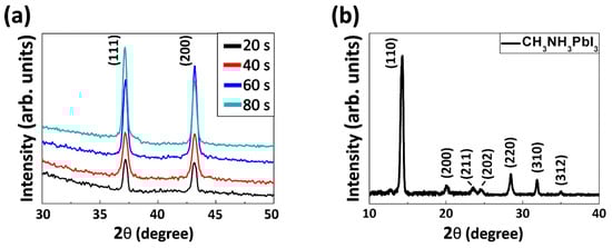 The XRD diffraction patterns show: (a) NiOx hole transport layers deposited times for 20 s, 40 s, 60 s, and 80 s, respectively. All NiOx films were annealed at 500 °C for 1 h; (b) the XRD diffraction peak of a CH3NH3PbI3 perovskite film.