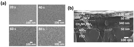 Figure 4a shows the surface microstructure and morphology of various thicknesses of NiOx HTLs processed at different deposition times. Obviously, all the NiOx HTLs uniformly cover the FTO surface without pinholes. We can observe the NiOx grain size increases as the sputter deposition time (20–80 s) increases. As a result, the resistivity of the NiOx films layer decreases since the area of grain boundary reduces. Here, the NiOx HTL is also known as the electron blocking layer, which can prevent intimate contact between the CH3NH3PbI3 and the FTO. Therefore, the NiOx layer can prohibit e-h charge recombination at the interface. A typical cross-sectional view for the inverted (p-i-n structure) perovskite solar cell NiOx/CH3NH3PbI3/C60/BCP/Ag is clearly shown in Figure 4b. All layers show uniform thickness without any pinhole. The thickness of each NiOx HTL layer is measured to be 50 nm, 340 nm, 50 nm, and 100 nm, respectively.