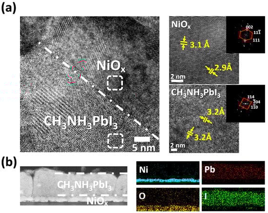 The ex-situ X-ray diffraction patterns were recorded on a high resolution X-ray diffractometer equipped (Bede D1) with Cu-kα that operate conditions are 45 kV and 35 mA, radiation at a scanning rate of 2 °/min. The optical transmittance spectra of NiOX films was recorded with an ultra violate visible (UV-vis) spectrometer (LAMBDA 900, PerkinElmer, Waltham, MA, USA). The surface morphology and cross-section structure used a high-resolution field emission scanning electron microscope (FE-SEM, JSM-7610F, JEOL Ltd., Tokyo, Japan). The wavelength of Photoluminescence (PL) (Agilent Technologies, Santa Clara, CA, USA) excitation was set to be 633 nm. Hall Effect measurement was investigated using nanometrics HL5500. The ultraviolet photoelectron spectroscopy (UPS, Atlanta, GA, USA, PHI 5000 Versaprobe II, ULVAC-PHI) of the He source is used to measure the work function. High-resolution transmission electron microscope (HRTEM) was used to observe crystal structure and energy dispersive X-ray spectrometer (EDS) was applied to map for elemental distribution (FE-TEM, JEM-2010F, JOEL). TEM sample was cut and thinned with a dual beam focused ion beam (FIB, Helios 1200+, FEI, Lausanne, Switzerland). Under 1 sun illumination (100 mW/cm2, AM 1.5G), a computer-controlled digital source meter (Keithley 2400, Cleveland, OH, USA) was used to measure the current density and voltage (J-V) curves characteristic. The light power of a solar simulator (Oriel Sol3A class AAA, Newport Corporation, Irvine, CA, USA) was set to be 450 W. Before each measurement, an NREL-certified silicon solar cell (Oriel 91150V) with a KG-5 filter was used to calibrate light intensity []. The PCE scan was set to start from 1.2 to −0.2 V, then the scan rate of voltage was fixed at 50 mV/s.