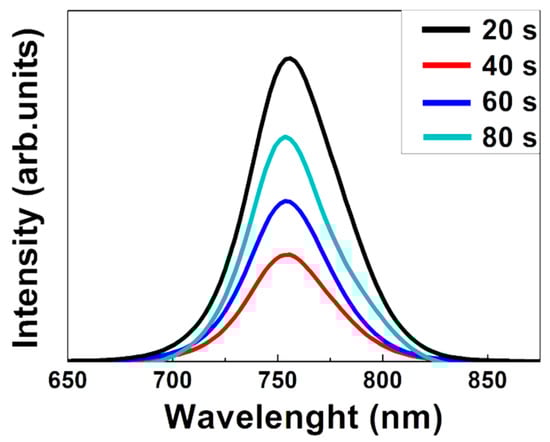 PL spectrum for CH3NH3PbI3 perovskite film onto FTO/NiOx hole transport layers treated at various deposition times: 20 s, 40 s, 60 s, and 80 s, respectively.