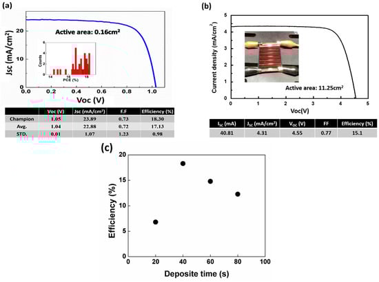 Jsc-Voc curve and PCE related parameters of the perovskite device: (a) the statistic PCE from 36 devices are given as an inset (red bar chart). The average efficiency is 17.13%. A table shows averaged values and standard error of Voc, Jsc, FF, and efficiency of 36 devices under AM 1.5G illumination (active area 0.16 cm2).; (b) the perovskite device photograph for the module (25 cm2) with an efficiency of about 15.1% (active area 11.25 cm2). (c) shows the PCE efficiency of perovskite composed of NiOx thin films that annealed at 500 °C for 1 h with deposit times: 20 s, 40 s, 60 s, and 80 s, respectively.