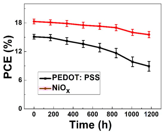 Compared the long-term perovskite device stability of CH3NH3PbI3 perovskite photovoltaic cells fabricated for the PEDOT:PSS and NiOx HTLs (thickness = 50 nm) (Figure 8). The durability test is carried out at RH = 40% and 25 °C. In general, the efficiency of perovskite solar cell devices with NiOx HTL is about 1.2 to 1.8 times superior to that with PEDOT:PSS. After 1200 h test, the CH3NH3PbI3 perovskite photovoltaic cells fabricated from NiOx and PEDOT:PSS decays 15.0% and 40.9% of their initial efficiencies, respectively.
