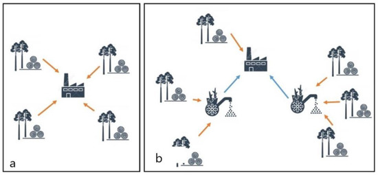 Figure 1. (a). traditional forest biomass supply chain, showing transportation from forest directly to central manufacturing facility; (b). bio-hub configuration, showing intermediate processing centers located between forest and central processing facility.