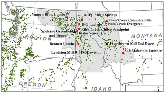 Figure 2. Proposed forest depot configuration in northern WA, ID and MT. Included are processing facilities (black triangles), forest depots (red circles), and biomass sources (green dots). Source: Martinkus et al., 2018.