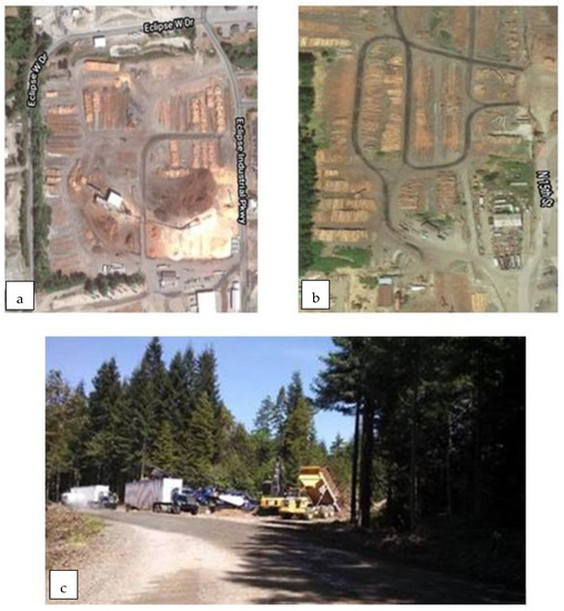A number of collection points exist in the Pacific Northwest between the forest and the processing facility which serve to add value to various forestry feedstocks. They are much simpler than the depots proposed by Lamers et al. (2015b) [5] and can include some level of in-woods or near-woods biomass processing (for example drying, chipping, grinding, log bucking). Successful examples, illustrated in Figure 4, include chip yards (e.g., Hermann Brothers Port Angeles), transfer yards, sort yards (e.g., Thompson Sort Yard), merchandizing yards, and centralized landings (e.g., Steve Morris, Arcata, CA) for in-woods grinding. To date, no biorefineries in the Pacific Northwest plan to use satellite depots to preprocess their feedstock in the format suggested by Lamers et al. (2015b) [5]. The Red Rock Biofuels plant scheduled to start up in Lakeview, Oregon will use forest biomass delivered directly by truck from the forest to the biorefinery. Delta Airlines, before COVID-19, was reportedly considering constructing a biorefinery in western Washington. It would use direct delivery of ground forest harvest residues from the forest to the biorefinery. Centralized landings for accumulating and densification of biomass may be part of the supply chain.