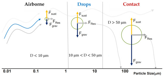 Pathogens (e.g., SARS-CoV-2) expelled by the respiratory processes of infected people have three potential modes of transmission [11,12]: (i) infection by suspended particles (bioaerosols) via inhaling airborne respiratory droplets, (ii) droplets that travel directly to the mucosal surfaces of the susceptible host from the infected individual, and (iii) direct contact of respiratory droplets with contaminated surfaces (fomites). The importance of viral transmission via small airborne microdroplets and droplet nuclei (known as ‘aerosols’) has been widely discussed in the context of the COVID-19 pandemic [7,9,13,14,15]. Airborne transmission, therefore, is one of three commonly accepted modes of viral transmission. Figure 1 illustrates the typical trajectories of particles in air for sizes between 0.01 μm and 100 μm. In addition to particle size, the behavior of these trajectories depends on factors such as initial velocity and flow field velocity. In Figure 1, the gravitational force () and aerodynamic forces (lift force, , and drag/air resistance force, ) that act on the particle in air, which dictate its movement, are shown with particle diameter and corresponding dominant type of transmission mode.