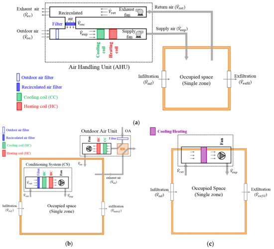 Selected HVAC systems schematic used to serve a single-zone highly occupied indoor space simulated in this study. (a) central air handling system (CAHS), (b) dedicated outdoor air system (DOAS), (c) wall unit system (WUS).