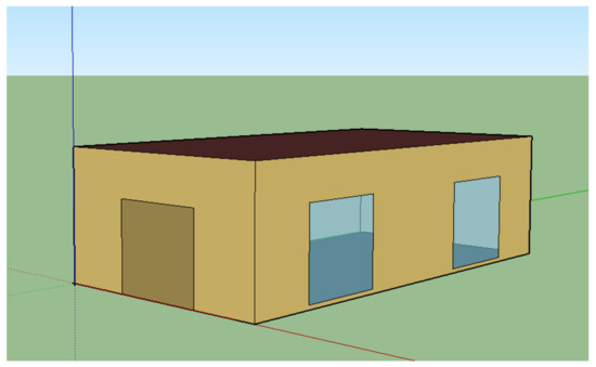 As an example of a highly occupied indoor space, a representative bar/pub in Tarragona (Spain) was selected. It was served by three types of HVAC system, and its dimensions are given in Table 1. The bar/pub is part of a bigger building which is, at the same time, a hotel. Figure 3 illustrations a 3D view of the supposed representative single-zone room considered in the simulation. The main façade faces north. The bar/pub also has a door (2 m × 2 m facing south on the front wall) and two windows facing east on the left side of the building. As the hotel is a conditioned space at similar temperature as the bar/pub, it is also assumed that the floor, ceiling, and right and back walls of the room are adiabatic. The thermal transmittance, U, of the components of the building envelope are set to the limit values of thermal transmittance allowed for the January climate zone of Tarragona (Spain) according to the Technical Building Code of Spain. The details of U values and other input parameters are listed in Table 1.