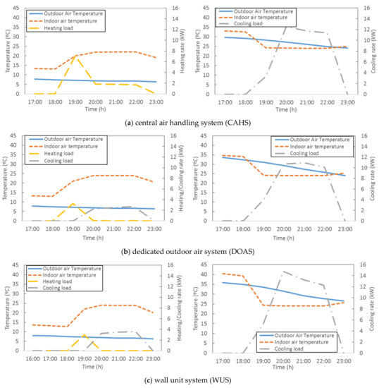 Figure 4 shows the simulated thermal load (heating and cooling loads) and temperature profile (outdoor and indoor air) for the design days in summer and winter conditions and for the three HVAC systems studied. As the conditioned zone is highly occupied, the thermal loads are especially affected by occupancy density (i.e., of 100 #/100 m2), resulting in a much higher requirement for cooling than heating. In this respect, heating requirements are mostly required on cold days to heat the outdoor airflow into the space.