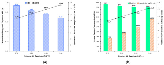 Figure 6. Effect of mechanical ventilation using outdoor air: (a) on the NIE of CAHS for 3 h per day of continuous exposure; (b) associated electricity and natural gas consumption.