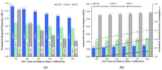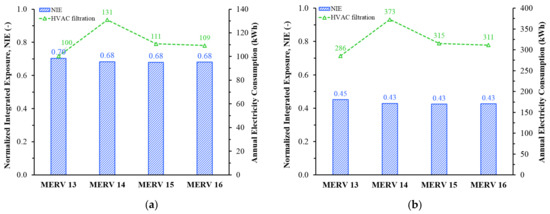 Figure 8. Effect of recirculated air filtration using HVAC filters on the NIE and its associated additional electricity consumption for 3 h per day of continuous exposure: (a) CAHS, (b) DOAS. - Portable air cleaner (PAC): The use of a PAC to reduce the virus-laden bioaerosol exposure of building occupants is an advantage when extra ventilation using outdoor air and/or recirculated air filtration is not possible, as in the case of WUS. Hence, the effect of PAC on the reduction of aerosol exposure was simulated with each type of HVAC system (i.e., CAHS, DOAS, and WUS, as shown in Figure 2) serving the indoor space. The effect of the PAC on NIE was simulated using six different CADR values, which are specified in Table 2 in terms of EACHpac (i.e., 1.0–6.0 h−1). For the three HVAC types, Figure 9 compares the influence of PAC on the reduction of aerosol exposure to the base-case in terms of NIE. When the EACHpac was increased from 1.0 h−1 to 6 h−1, the maximum airflow rate via the PAC was approximately 42 l/s to 253 l/s with a filtering efficiency of 99% for an aerosol diameter of 1.0 μm. The electricity consumed by the PAC to deliver the clean ACH is also depicted in Figure 9. The influence of the PAC CADR on the NIE is similar in the CASH and DOAS (it decreases in both from 0.92, when the CADR is 150 m3/h, to 0.65, when the CADR is 900 m3/h), and much higher in the WUS (it decreases from 0.61, when the CADR is 150 m3/h, to 0.20, when the CADR is 900 m3/h). The increase in energy consumption with the PAC unit is small, always below 200 kWh/year.