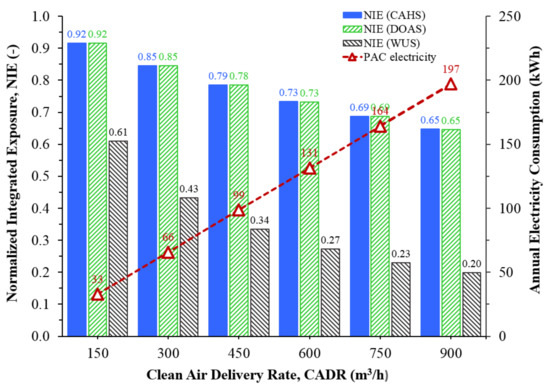 Figure 9. Effect of portable air cleaner (PAC) on the NIE of the three HVAC systems (CAHS, DOAS, and WUS) for 3 h per day of continuous exposure and associated annual electricity consumption. - Exhaust fan: The commercially available box fans can be installed in a room (e.g., in windows or doorways) to exhaust contaminated air out of the indoor space, thus reducing the exposure of occupants to infectious bioaerosols. The effect of the exhaust fan on NIE, which was simulated with different capacities (maximum airflow rates, Table 2), is shown in Figure 10. Electricity consumed by the exhaust fans can be estimated as it was for the PAC (Figure 9) by using the operating hours and rated power of the box fan, indicated on its nameplate, existing in the market.