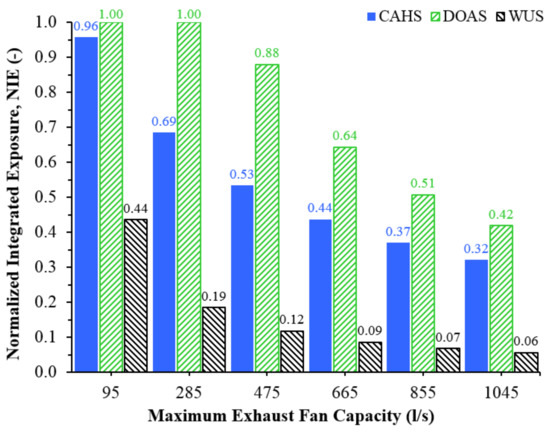 Figure 10. Effect of exhaust fan on the NIE of the three HVAC systems (CAHS, DOAS, and WUS) for 3 h. per day of continuous exposure.