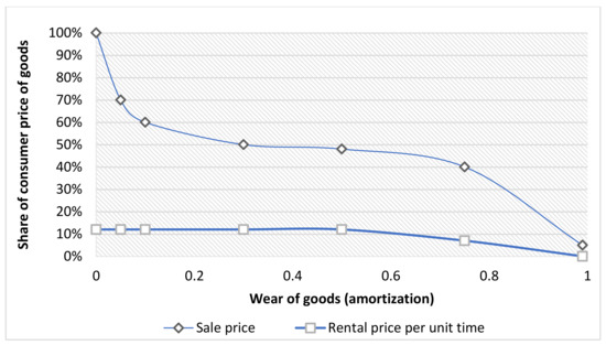 Figure 2 shows that in the case of the production of goods, their sale price is 100% and includes all the expenses for display and sale. In the case of zero use of the product, most sellers sell it at the total sale price on the market. In the case of leasing out the same effect, its rental price is on average 12% of the sale price and changes only when the product is worn by 80%. Unlike a rental yield, the sale price changes with the wear and tear of the product and even at maximum wear and mostly in invalid condition, it can be sold at a price of about 5% of the initial sale price in the absence of use. In contrast, the product losing consumer properties can no longer be leased out. It proves that the leased goods are stable in the rental price, which primarily includes depreciation expenses and the owner’s profit and is less dependent on the product condition.