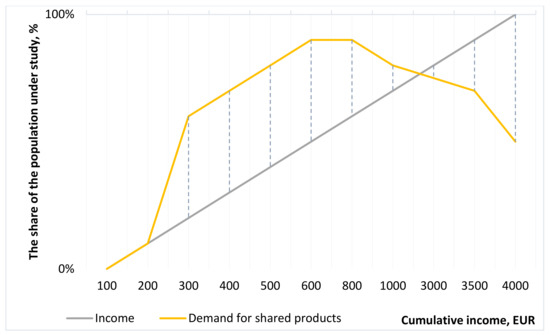 Prices for sharing goods determine their demand, which is reflected in the supply of goods. As 2020 and 2021 featured the increasing number of Internet users and declining incomes of most of the Ukrainian population, the demand for sharing services increased according to most online stores and customers leaving feedback about products on social networks. According to Olx.ua [19], the Rozetka online store and the survey of 50 respondents on social networks, one conducted a study on the demand for shared goods depending on the individual’s income (Figure 3).