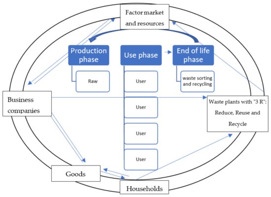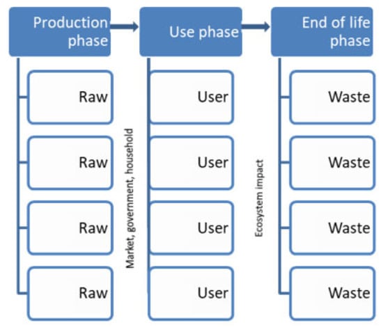 In the case of the linear economy (Figure 4), we can see a situation when resources are used to produce goods designed for one owner or user, which reduces the consumer properties of goods. The market and movements of financial resources around interests are limited, which is lesser than during sharing adoption. The resource–product–consumption–waste scheme has a negative ecological effect because of the increasing anthropogenic impact caused by a large amount of waste and production, resulting from the higher demand for new goods among consumers.