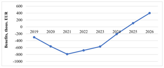 Following Table 2, one can conclude that the enterprise will earn 163,532 EUR within seven years in case of shifting from products to services. The overall benefit over the seven years will be 399,459 EUR. Still, the project will start paying off on the sixth year, i.e., from 2025, when the overall benefit of the project will be 107,828 EUR, while on the fifth year the project won’t pay off with a total loss of 210,433 EUR (Figure 6) [33].