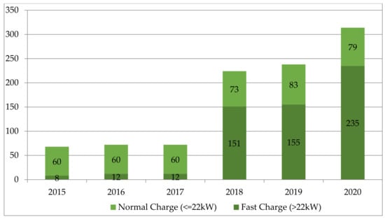 The authors believe that the purchase of electric vehicles contributes to the future of the company as well as to the environmental friendliness. For example, Latvia has 72 charging stations, eight of which are located in Riga (CSDD, 2019). Electricity fees in Latvia also include the total number of electric cars. Total number of normal and fast public charging points in Latvia are shown in Figure 7.