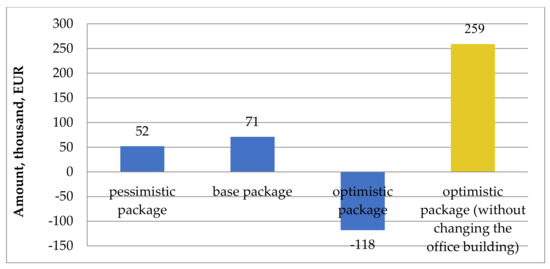 On the other hand, the authors point out that the optimistic package results in a total loss of 117,664 EUR over five years, as the number of projects is expected to be implemented in this package. The main reason for the losses is company’s moving to the new office building. If the structure remains the same, the total benefits for the company would be 259,026 EUR.