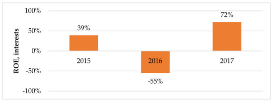 Following Formula (7), one can conclude that the company is a part of all examined years within the optimal limits of total liquidity (1–3). However, note that in 2016, the company’s total liquidity was close to the lowest optimal threshold, i.e., 1.1, which cannot be assessed too positively, as when this figure falls below 1, the company could fail to settle short-term liabilities. In 2015, however, this indicator reached the optimal upper limit of 3, which cannot be judged too positively. If this indicator is above 3, it means the use of inefficient working means. On the other hand, in 2017, the company’s total liquidity was 1.5, which should be assessed positively based on information from Lursoft (2019), and 0.70 on average in the sector in 2017 [33].