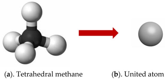 Here, the TraPPE as one of united atomic forces is chosen to construct a methane model. This force field, first proposed by Martin and Siepmann [34], provides a set of optimized Lennard–Jones (LJ) parameters for commonly used n-alkanes and has good applicability in methane model construction. In this force field, all bond lengths are constrained at equilibrium positions, vibration is not allowed, and there is no covalent bond stretching potential. The non-bond interaction of TraPPE field includes van der Waals interaction and electrostatic interaction, which are described by LJ 12-6 potential and Coulomb potential respectively. Therefore, by hiding the hydrogen atom directly connected with a carbon atom by a covalent bond in a carbon atom, a methane molecule is simplified into a single united atom, and the potential energy parameters of methane molecules is shown in Table 1, and the model is shown in Figure 1.