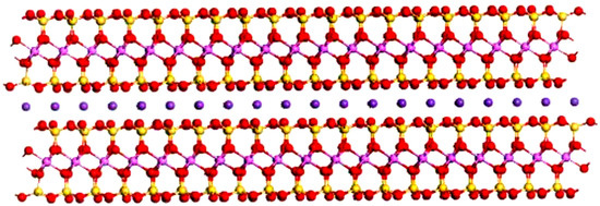 Schematic diagram of illite structure. The red particles are oxygen atoms, the yellow particles are silicon atoms, the pink particles are aluminum atoms, and the purple particles between layers are potassium ions.