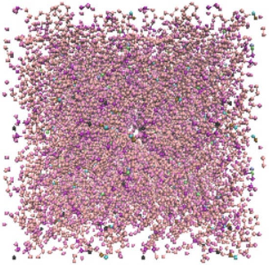 Kerogen is the main component of shale organic matter, usually without a fixed molecular structure, and is related to factors such as the depositional environment during its formation. The type II of the kerogen molecular model used in this paper is constructed with reference to existing research results [37,38,39]. Table 2 shows the ratio of each element to carbon. The main structure of the kerogen molecule is composed of four to five aromatic hydrocarbons with alkyl groups as linkers. Oxygen atoms appear randomly in aromatic hydrocarbons or on the alkyl chain, and nitrogen and sulfur atoms exist as heterocyclic rings [40]. According to the above principles, multiple kerogen molecules are combined and then the NPT ensemble is used to optimize the model unit cell. The optimized kerogen is shown in Figure 4, and its density is 1.25 g/cm3.