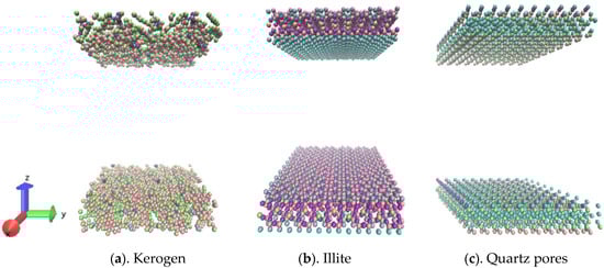 Both organic matter and clay minerals in shale can adsorb methane [32,33]. Therefore, before using molecular simulation technology to study methane adsorption, molecular models of methane, illite, quartz, and kerogen were constructed based on different force fields.
