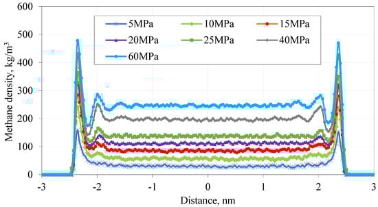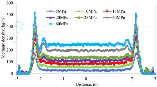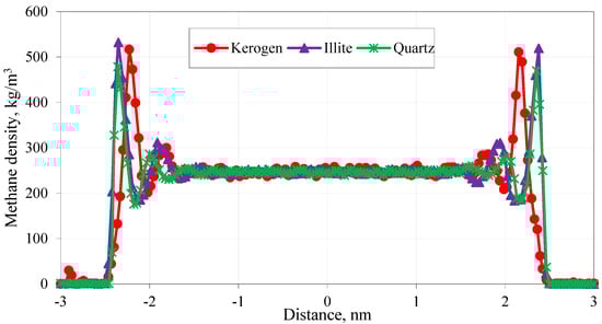 Methane density distribution curves in the slit-shaped pore space of kerogen (including pore walls).