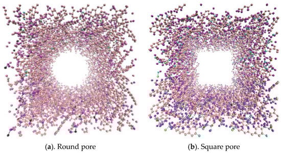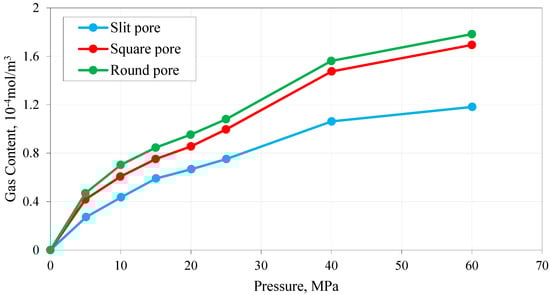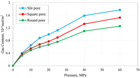 Shale organic pores as an important place to reserve adsorbed gas mainly include micropores (<2 nm) and mesopores (2~50 nm) [42]. Although the pore shape of shale is complicated, containing slit pore, round pore and square pore [43], only the slit-shaped pore is generally considered because of its simplicity. In this paper, the round pore and square pore with a cross-sectional diameter of 3 nm based on the kerogen model is further constructed, as shown in Figure 8, besides building silt pore, as shown in Figure 5a. The simulated temperature is 90 °C and the simulated pressure is still from 0 to 60 MPa. The simulation results are shown in Figure 9 and Figure 10. The results show that the adsorption capacity of methane per unit area from large to small is slit > square pore > round pore. The adsorption capacity of methane per unit volume from large to small is round pore > square pore > slit. For a slit-shape pore, its wall surface has been fully expended with almost no interaction between the potential energy fields on the same side wall surface, and the effect of wall space on adsorption is the greatest, so the adsorption capacity per unit area of the slit is the largest, and the adsorption capacity per unit volume is the smallest. Relatively, for a round pore, due to the bending of the pore wall, the wall potential energy field is superimposed everywhere, and the wall potential energy is the strongest, but the adsorption space is limited, so adsorption capacity per unit volume is the largest, and the adsorption capacity per unit area is the smallest. The characteristics of the square pore are between the characteristics of the slit pore and the circular pore, so the adsorption capacity is also between them.
