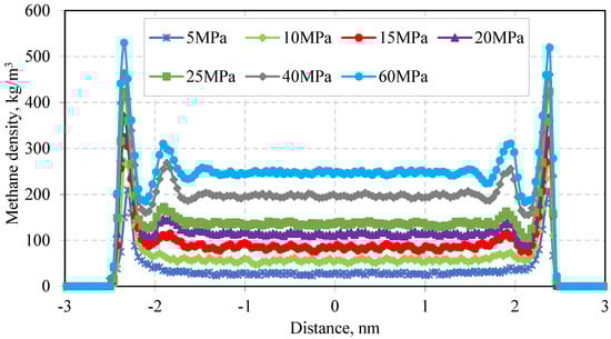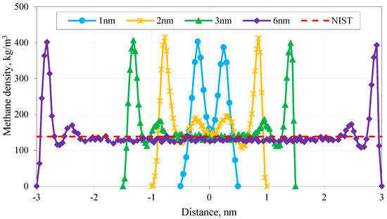 Chen et al. [44] deemed that when the pore size is close to the collision diameter of gas molecules, there may be microscopic differences in the adsorption behavior of organic matter. Based on the slit pores of kerogen, the methane adsorption under six groups of different pore sizes (1 nm, 2 nm, 3 nm, 4 nm, 5 nm and 6 nm) at a temperature of 90 °C and a pressure of 25 MPa was simulated. The results are shown in Figure 11. Among them, the red dotted line in the figure is the density of free methane at simulated temperature and pressure, which is 138.226 kg/m3 (from the NIST database). Studies have shown that when the pore diameter is less than 2 nm, the methane density in the middle of the pore is higher than the free state methane density, indicating that the superposition of potential energy occurs in the pore wall at this time, and the methane in the entire pore is adsorbed. Monomolecular adsorption occurs at 1 nm, and bilayer adsorption occurs at 2 nm. When the pore size is greater than 2 nm, the methane density in the middle of the pore is similar to the free state methane density, indicating that there is no interaction between the pore walls at this time. Except for the double-layer adsorption behavior near the pore wall, other methane away from the pore wall should be free state.