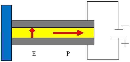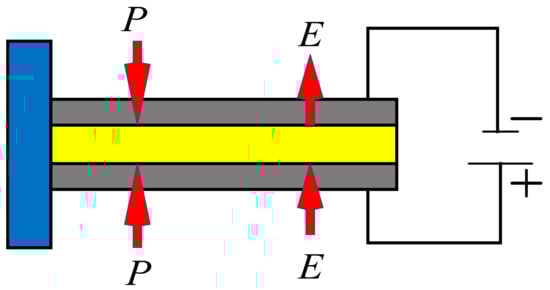Although the piezoelectric d33 mode conversion can achieve higher voltage output, particularly for low-pressure sources and occasions where the size is limited, and the electrode configuration is simplified, the advantages of d33 over d31 are not so obvious. The d31 mode has greater advantages, especially in microelectromechanical system applications [60]. Therefore, the most commonly used piezoelectric harvester is the d31 mode, and the normal strain is perpendicular to the electric field direction. This is because under such conditions, the piezoelectric material can operate in pure bending mode at low cost. The sketch of the operating mechanism of the d31 mode is shown in Figure 9.