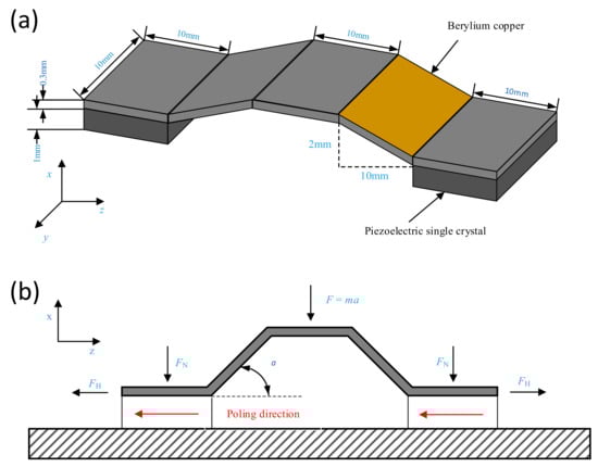 Working principle of the BSPEH. (a) Schematic of the energy harvester and (b) Mechanical analysis of the structure [37].