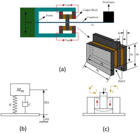 (a) Schematic and (b) SDOF model of the proposed S-CANDLE device. The arrows in the PMNT wafers indicate the poling direction. (c) Force analysis of the middle copper block and one PMN-PT wafer. Adapted from [45].