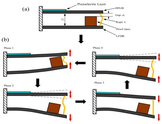 Zhang et al. [83] proposed a tunable frequency piezoelectric energy harvester. As shown in Figure 12, a novel impact and rope-driven hybrid mechanism is used and the high-frequency generating beam is triggered by a rope or is directly impacted by a low-frequency driving beam. It is shown that by adjusting the rope margin from 0.5 mm to 2 mm, the center operating frequency of this piezoelectric vibration energy harvester can be easily changed from 74.75 Hz to 106 Hz by adjusting the rope margin from 0.5 mm to 2 mm, which can achieve a bandwidth 4.2 times higher than that of a conventional piezoelectric vibration energy harvester.