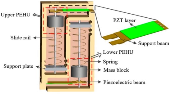 Yin et al. [84] proposed a dual-impact drive FUC-PEH system consisting of two piezoelectric energy harvester units, as shown in Figure 13. Based on the single-degree-of-freedom system and the piezoelectric coupling factor, the corresponding model was established. Theoretical calculations and experimental tests show that the energy harvester can achieve high power output in the frequency range of operating band from 3.5 Hz to 15 Hz under different accelerations. The average output power is 1.17 mW at an acceleration of 6 m/s2 and a frequency of 9.8 Hz, while the average output power can reach 1.86 mW at an excitation frequency of 15 Hz.
