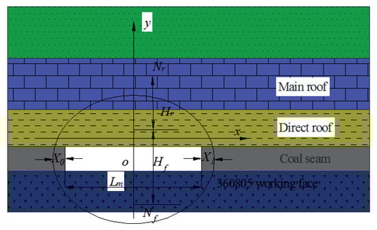 Figure 3 illustrates that Nr is the number of fractured strata sequences in the roof; Nf is the number of fractured rock strata sequences in the floor; Hr is the fracture extension height in the roof (m); Hf is the fracture extension depth in the floor (m); X0 represents the width of the plastic zone at the rear arch corner of the 360,805 working face (m); X1 is the width of the plastic zone at the rear arch corner of the 360,805 working face; and Lm is the advancement length of the 360,805 working face (m).