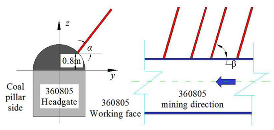 The blast hole depth was determined according to the roof-cutting height and dip angle of the borehole, as shown in Figure 5. The dip angle of the borehole was taken as α = 60°, and the deviation angle of the borehole toward the 360,805 goaf was β = 80°. Thus, the depth of the blast hole is