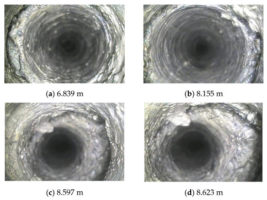Drilling construction was conducted 400 m away from the gate by using a drilling peep to observe the roof separation cracks of the goaf adjacent to the 360,805 machine roadway, as shown in Figure 8. The advanced roof-cutting pressure-relief blasting effect of the 360,805 conveyor roadway was evaluated and analyzed to alleviate the disturbance caused by the 360,805 goaf to the roof of the adjacent 360,803 airway. Figure 8 shows that the roof condition is less damaged at a depth of about 6 m. When the depth is about 8 m, the surrounding rock damage degree is large possibly because of the drilling process. On the whole, the surrounding rock in the deep part of the roof has good stability.