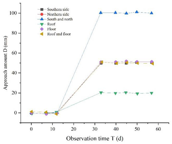 Figure 9 shows that the two sides of the roadway surrounding rock move the most, reaching about 100 mm, and the bottom heave is also relatively large at about 60 mm with roof subsidence of about 20 mm.