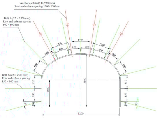 The 360,803 air roadway adopts anchor mesh cable support, and the support parameters are as follows: The anchor bolt is a φ 22 mm × 2500 mm left-handed metal strong bolt, the row spacing between roof bolts is 800 × 800 mm, the row spacing between side anchors of the three-core arch section is 850 × 800 mm, the row spacing between the side anchors of the flat-top section is 800 × 800 mm; and the anchor cable is a φ 21.8 mm × 7200 mm prestressed steel strand anchor cable with row spacing of 1200 × 1600 mm and four pieces in each row, and φ is the bolt (anchor cable) diameter, as shown in Figure 10.