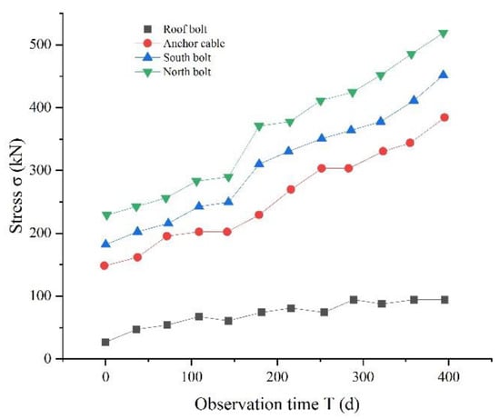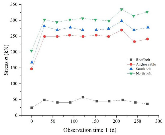 Figure 11, Figure 12 and Figure 13 show the stress of the anchor bolt (cable) of the surrounding rock of the 360,803 air roadway during the monitoring process. The stress change of the anchor bolt (cable) can directly reflect the deformation of the surrounding rock of the roadway. Figure 11, Figure 12 and Figure 13 indicate that the stress of the two sides of anchor bolts (cables) is relatively large, followed by the stress of the roof anchor cable, with the stress of the roof anchor bolt being the smallest. This finding shows that during the use of the roadway, the anchor cable of the roof plays a greater role in supporting the deformation of the roof after the roof is damaged. The anchor bolt of the roof is in the crushing area and bears less interaction force than the anchor cable. The role of the anchor bolt is mainly to control the displacement of the broken rock of the roof and to maintain the overall stability of the roof. The deformation of the surrounding rock of the two sides is mainly supported by the anchor bolts of the two sides.