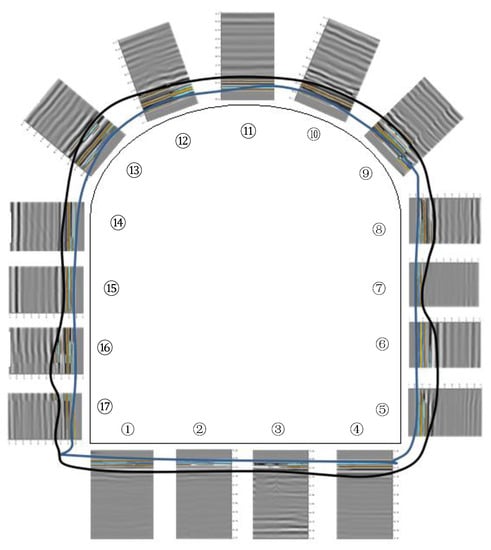 Drilling construction was conducted 400 m from the gate, and the surrounding rock loose circle in the 360,803 airway was tested using a geological radar, as shown in Figure 14. The floor was 2.5–3.8 m (mean value of 3.2 m), the north wall was 1.3–1.8 m (mean value of 1.5 m), the roof was 1.1–1.9 m (mean value of 1.5 m), and the south wall was 1.1–1.5 m (mean value: 1.4 m).