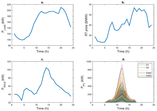 (a) Hourly demand curve, (b) RT market price, (c) wind turbine generation profile and (d) yearly PV generation profile aligned hourly.
